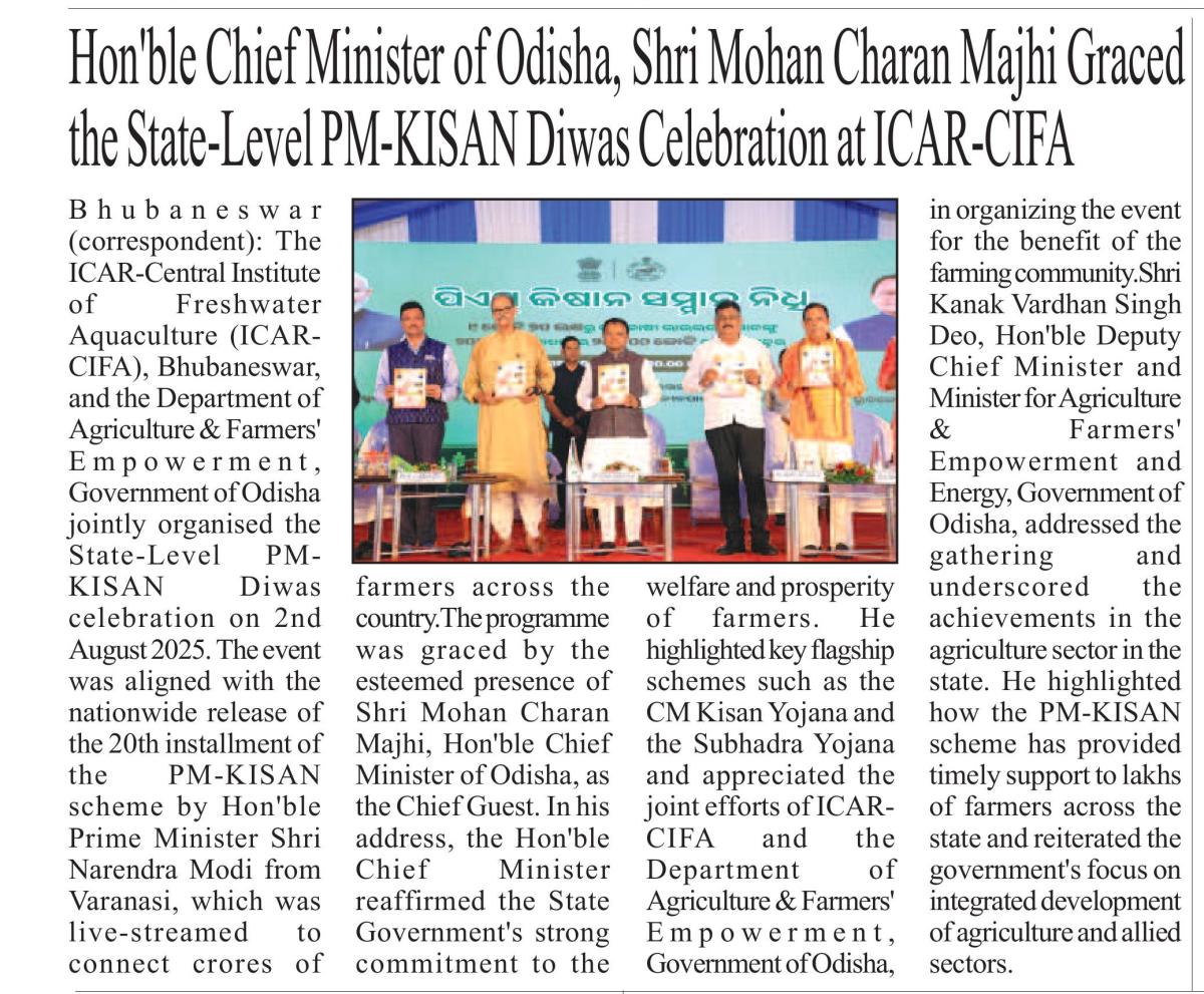 Hon’ble Chief Minister of Odisha, Shri Mohan Charan Majhi Graced the State-Level PM-KISAN Diwas Celebration at ICAR-CIFA