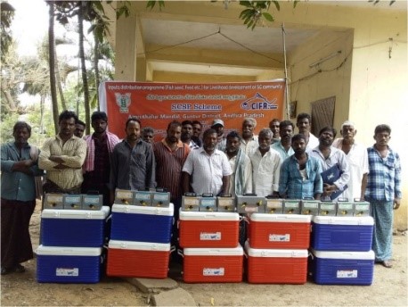 A taining-cum-demonstration programme on “Scientific Fish Farming and Management Practices in Freshwater Aquaculture” organized by RRC, ICAR-CIFA, Vijayawada at Kuchipudi village, Guntur District, Andhra Pradesh during 25-27 February 2020. A total of 30 fish farmers were participated in the training programme. The programme aimed at capacity building of SC farmers for improvement of livelihood and income generation. Dr. D. Srinivas, ADF, Vijayawada, Shri. B. Krishna Kishore, FDO, Kuchipudi, and V. Ratnaprakash, Programme Assistant, KVK, Guntur District, A.P. were present as resource persons. Inputs like portable water and soil test kits (10 nos.) and ice chillers (20 nos.) were distributed to the beneficiaries who had attended the training programme. Floating fish feed (50 bags) was distributed to the beneficiaries in the third phase of inputs distribution who have successfully adopted fish farming in Amruthalur block, Guntur district, Andhra Pradesh.