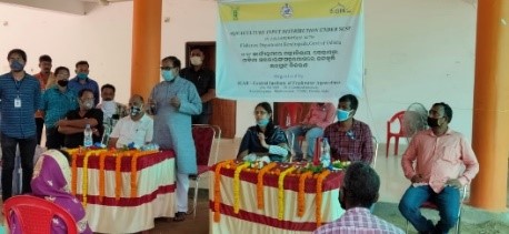 During Jan-Dec 2019, ICAR-CIFA has undertaken several activities in West Bengal, Andhra Pradesh, Odisha, Tamilnadu, Punjab states towards socio-economic development of Scheduled Caste people. Promotion of scientific carp culture, backyard poultry farming were undertaken. These activities have benefitted 997 families. Preliminary survey was conducted and baseline data were collected prior to implementation of the work. An workshop was conducted at kultali, West Bengal for development of action plan involving major stakeholders. The scientists of the institute also distributed carp seed and demonstrated carp seed rearing. They also demonstrated use of lime and supplementary feed in aquaculture for better production. The farmers, all belonging to Scheduled Caste community, were exposed for the first time to scientific carp culture. They are eager to learn and are enthusiastic about scientific ways of fish farming. In Punjab two workshops were held in order to create awareness about fish farming. Farmers, state department officials, KVK , SHGs took part in these programmes. In Tamilnadu cages developed by TANVASU were procured and distributed among SC farmers for rearing of poultry birds. One workshop cum awareness programme on “Benefits of Scientific fish farming for nutritional security” was conducted at Guntur ,AndhraPradesh. It is envisaged that socio-economic condition of the SC beneficiaries will improve through ICAR CIFA’s intervention under SCSP.